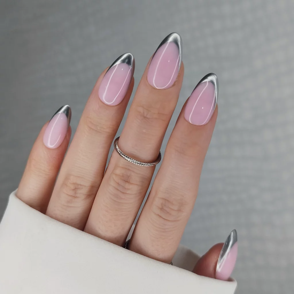 Ongles pailletésArgent, champagneLumineuxFestif chic